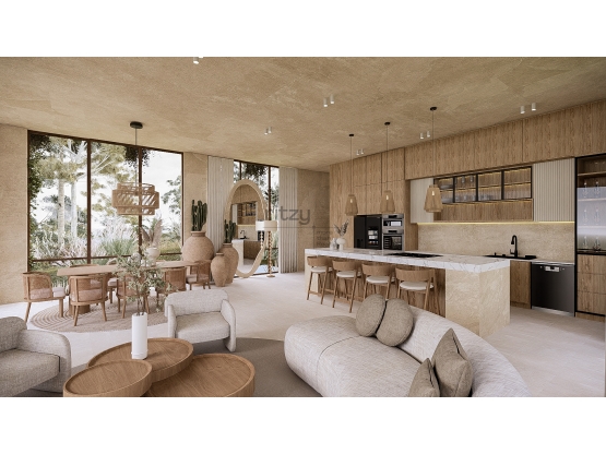 La villa cuenta con 110 m² de área construida interior más 173 m² de espacios exteriores, distribuidos en una elegante planta única que privilegia la amplitud, la luz natural y la conexión con el entorno. Dispone de dos amplias habitaciones con baño privado, baño social, cocina abierta integrada a la sala y comedor, y una terraza exterior que se convierte en el corazón social de la propiedad.